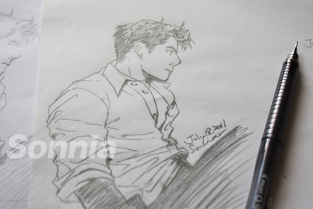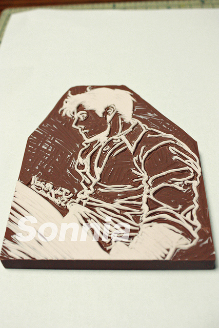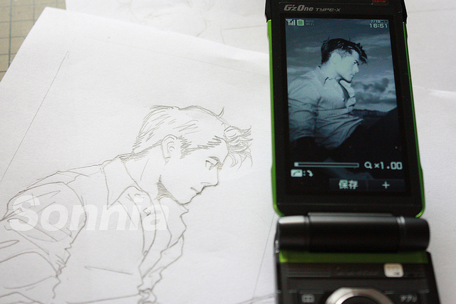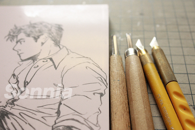 写真があんまりかっこ良かったんで、待ち受けにするだけじゃなくて描いてみたい気になりました(よせやいw)。下書きトレペにうつして…って…あれ?はんけしくんに転写。ヲイヲイ。…彫ったわ。押してみたところ。うーんなんでしょ。…『消しゴムはんこ』という言葉の響きにそこはかとなく感じていたかわいらしさは皆無ですな。あーそうか…これって版画だわ。この絵のせいで版画にすら見えないけどね。プリントごっこで印刷したのと間違われました。ふ。